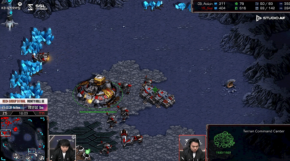 테란은 대규모병력의 공격을 막아내고 9시 멀티를 활성화시키는데 집중함